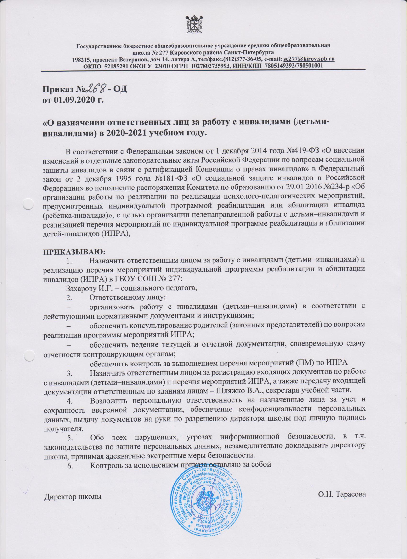 - Приказ "О Назначении ответственных лиц за работу с инвалидами (детьми-инвалидами) в 2020-2921 учебном году"